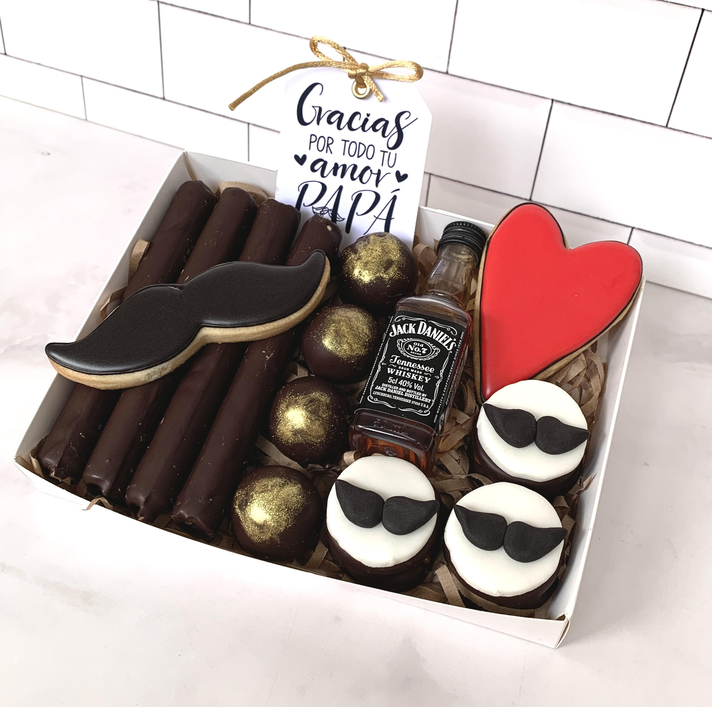 La caja contiene 4 cuchuflís rellenos con manjar bañados en chocolate, 4 popcakes (bizcocho con dulce de leche bañados en chocolate), 3 mini alfajores rellenos de manjar decorados con fondant, 2 galletas de mantequilla glaseadas diseño de corazón y bigote, una mini botella de Jack Daniels, tarjeta.